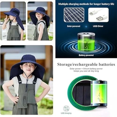 • ✔️Solar + USB dual charging: The Wide Brim Solar Fan Hat for Kids has a built-in 800mAh battery that supports real-time energy storage with solar panels and fast charging via a USB port. It provides an uninterrupted power supply for long outdoor activities such as hiking and camping, ensuring worry-free outdoor battery life.