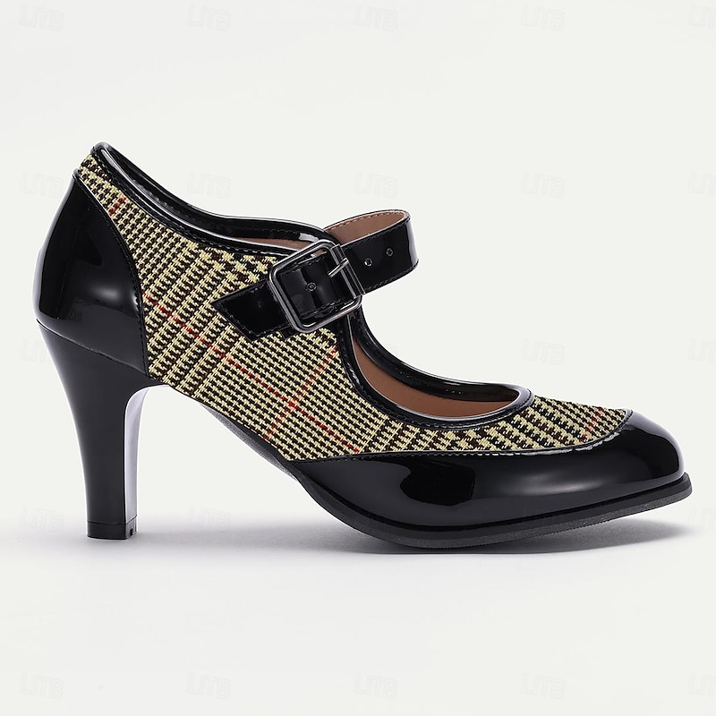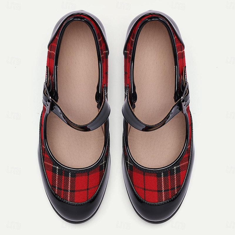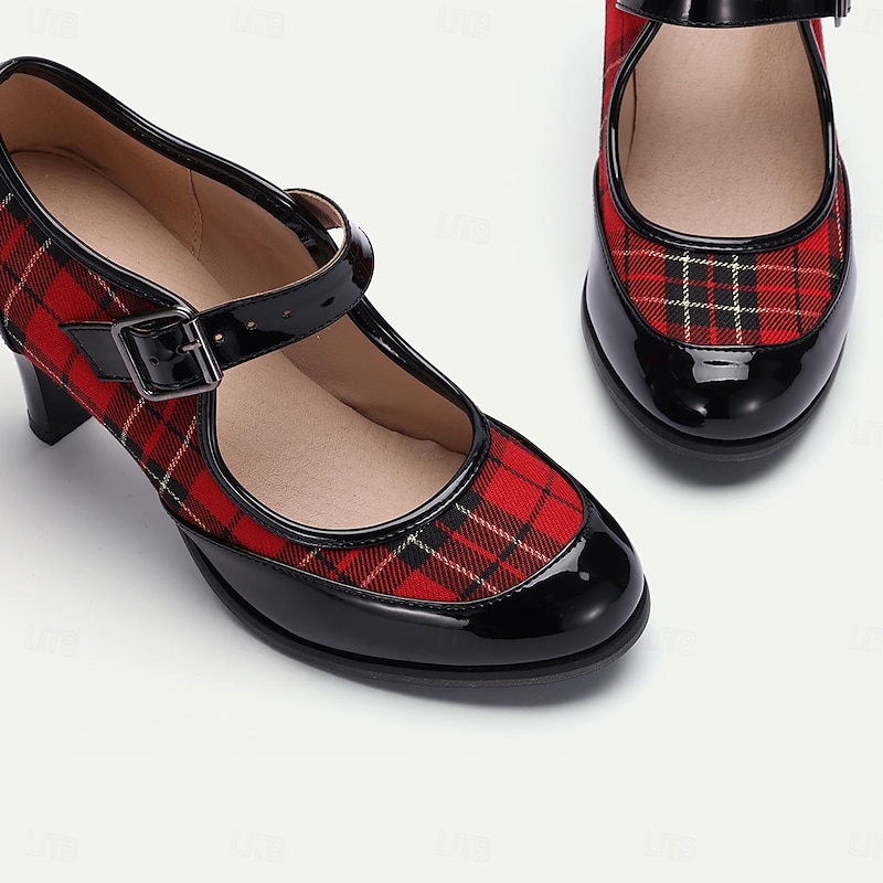 Highlights [Fabric] : Combining PU and quality fabric, the upper material of these women's heels features a vibrant red and black plaid pattern that highlights its elegant and classic charm. The shoes also incorporate glossy patent leather accents that enhance their sophisticated look and ensure long-lasting wear. [Design] : Stylish yet functional, the design blends a retro Mary Jane style with modern elements. The adjustable buckle strap ensures a secure and customizable fit, while the round toe and sleek stiletto heel provide a comfortable yet chic silhouette. These characteristics make them ideal for both casual and more formal settings. [Design Highlights] : The shoes are designed with a nod to vintage aesthetics, featuring a classic tartan plaid pattern and patent leather details that create a beautiful contrast. The adjustable buckle strap offers not only a functional element but also adds to the elegant and preppy style. [Occasions] : Perfect for daily wear, work environments, and casual outings, these Mary Jane heels add a refined touch to any outfit. Whether paired with office attire or a stylish weekend ensemble, they offer versatility across various occasions. [Size Notice] : Available in a standard size range from US5 to US13, these shoes cater to a wide variety of foot sizes. Customers are advised to select their usual size for the best fit.