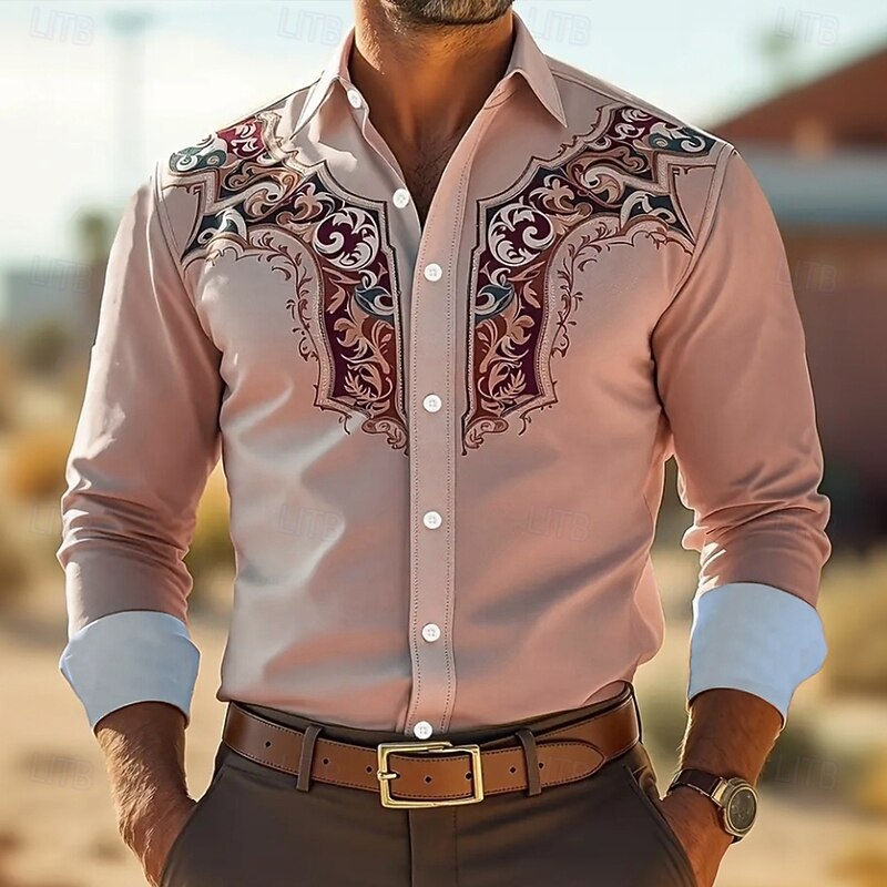 HOT ! Men's Scroll Floral Print Ethnic Shirt Western Shirt Cowboy Shirt Long Sleeve Vintage Retro Outdoor Vacation Spring Fall Turndown 3D Print Linen Like Shirt Light Khaki Pink Blue Purple