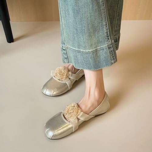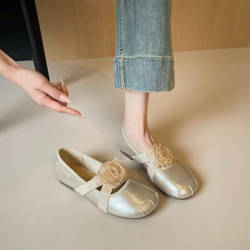 LUXINYU Women Round Toe Mary Jane Flats Pu Leather Elastic Flower Straps Low Heel Ballet Casual Praty Shoes 7
