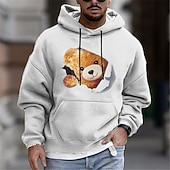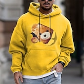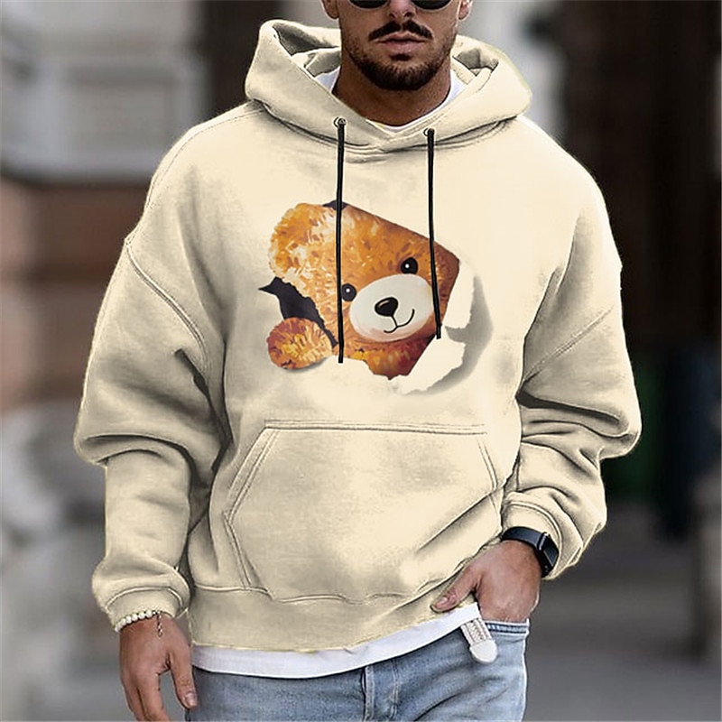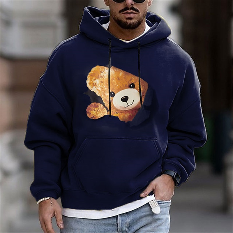 Highlights [Fabric] : Crafted from high-quality polyester, this men's hoodie offers a comfortable and durable wear suitable for both spring and fall. The material is soft, providing a cozy feel with micro-elasticity for added flexibility and comfort. [Fit] : The hoodie features a regular fit, ensuring it suits a variety of body shapes. It boasts a relaxed, loose structure with ribbed cuffs and hem, preserving warmth and style in equal measure. [Design Highlights] : Showcasing a playful bear graphic print on the front, this streetwear piece is both trendy and unique. The classic hooded neckline with an adjustable drawstring and a kangaroo pocket add practical and stylish elements to the design. [Occasions] : This versatile hoodie is perfect for daily activities and sports settings. It seamlessly pairs with jeans or casual pants, making it a great choice for both laid-back weekends and casual outings. [Size Range] : Available in a broad range of sizes from S to 3XL, catering to different body types and style preferences. The variety of colors, including blue, white, black, red, beige, navy blue, gray, purple, and yellow, offers further personalization.