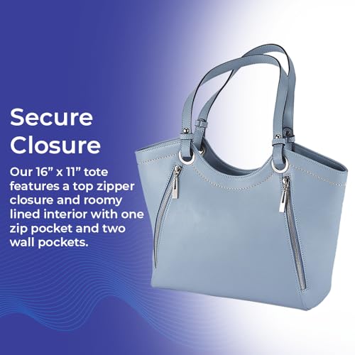 • SECURE CLOSURE Our 16” x 11” tote features a top zipper closure and roomy lined interior with one zip pocket and two wall pockets. The purse also has an exterior horizontal zip pocket on the back.
