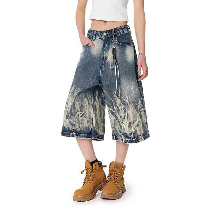 More information about BXCNCKD Unisex Lightning Pattern Denim Retro Gradient Loose Wide Leg Pants Straight Quarter Pants