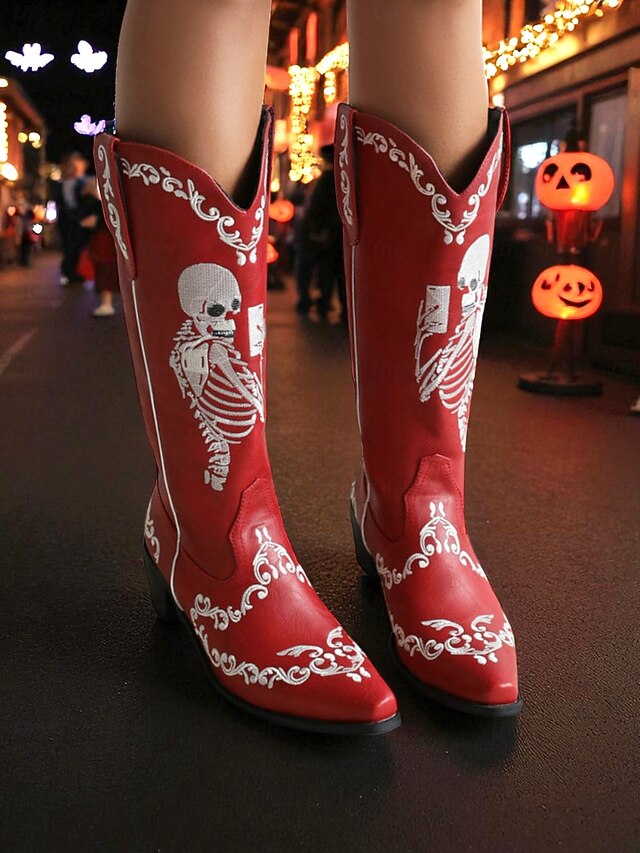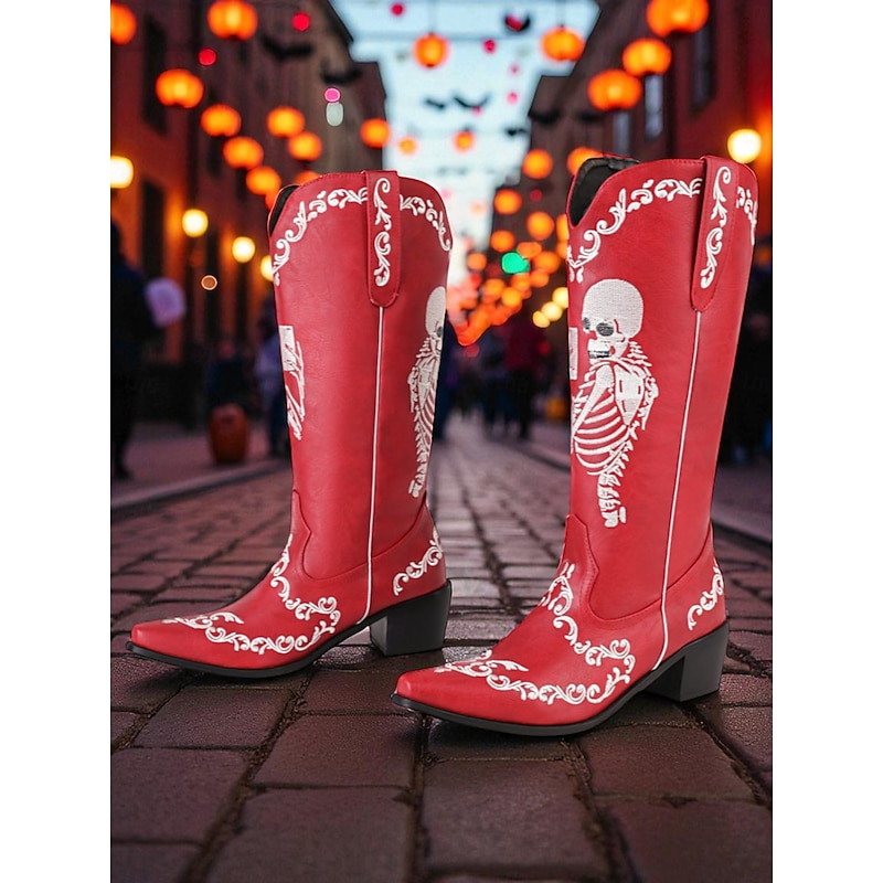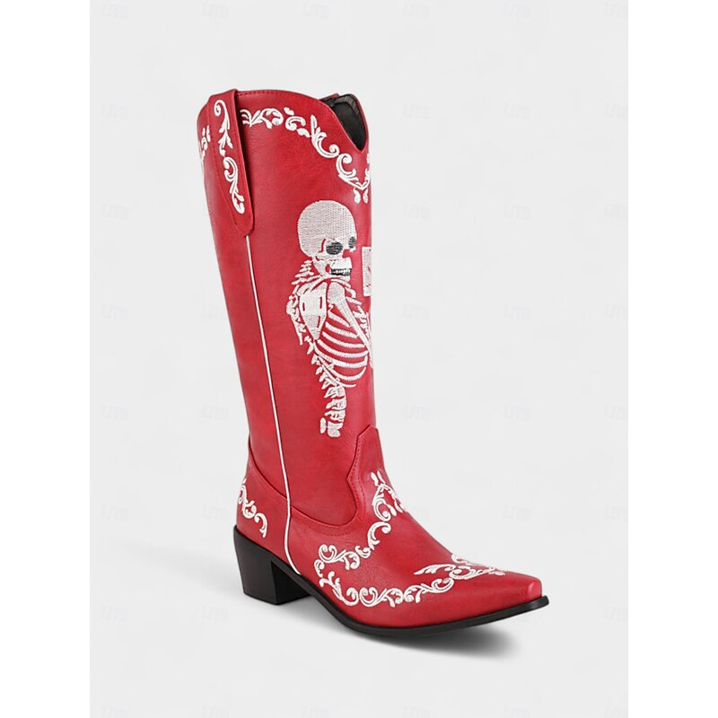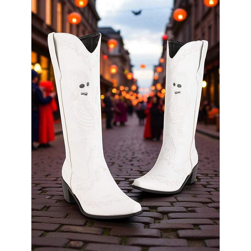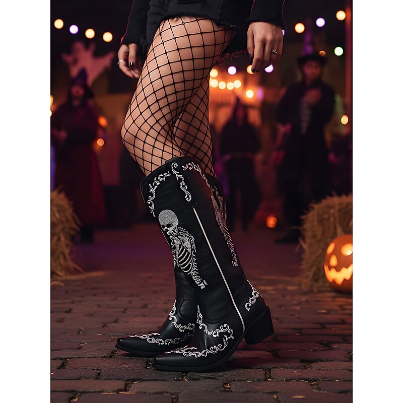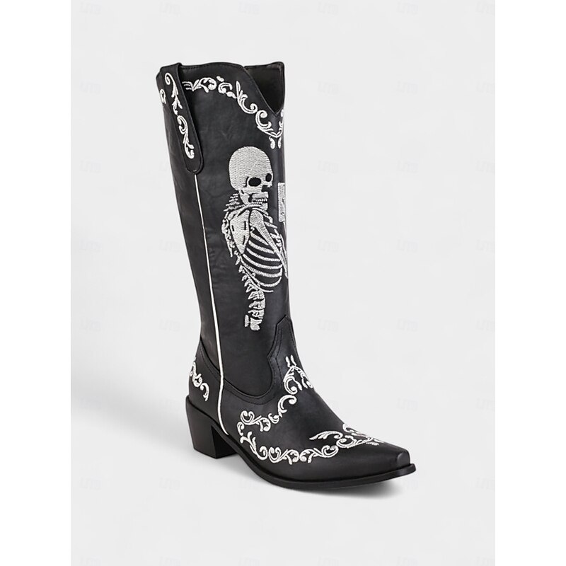HOT ! Women's Halloween Skeleton Embroidered Cowboy Boots – Gothic Western Tall Boots for Costume Parties, Spooky Festivals and Nighttime Street Style