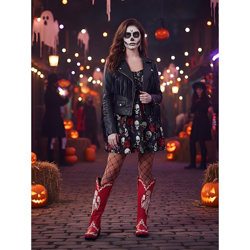 Women's Halloween Skeleton Embroidered Cowboy Boots – Gothic Western Tall Boots for Costume Parties, Spooky Festivals and Nighttime Street Style 19