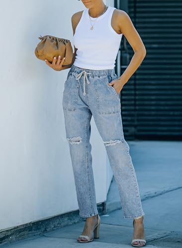 Sidefeel Women's Jeans Ripped Joggers Elastic Drawstring Waist Cargo Denim Pants Size 14 Light Blue 1