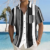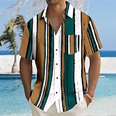 : Featuring a bold geometric pattern and striped print, the shirt exudes a contemporary Hawaiian resort style. It includes a classic turndown collar and a button-down front for a touch of elegance and functionality. The addition of a chest pocket enhances its practicality.