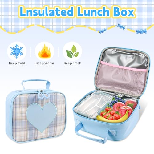 Cute Backpack for Girls, 5 Pack Kawaii Backpack Aesthetic Backpack with Lunch Box Set, Girls Blue School Bookbag for Kids Teen Elementary 4