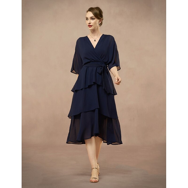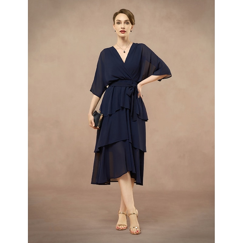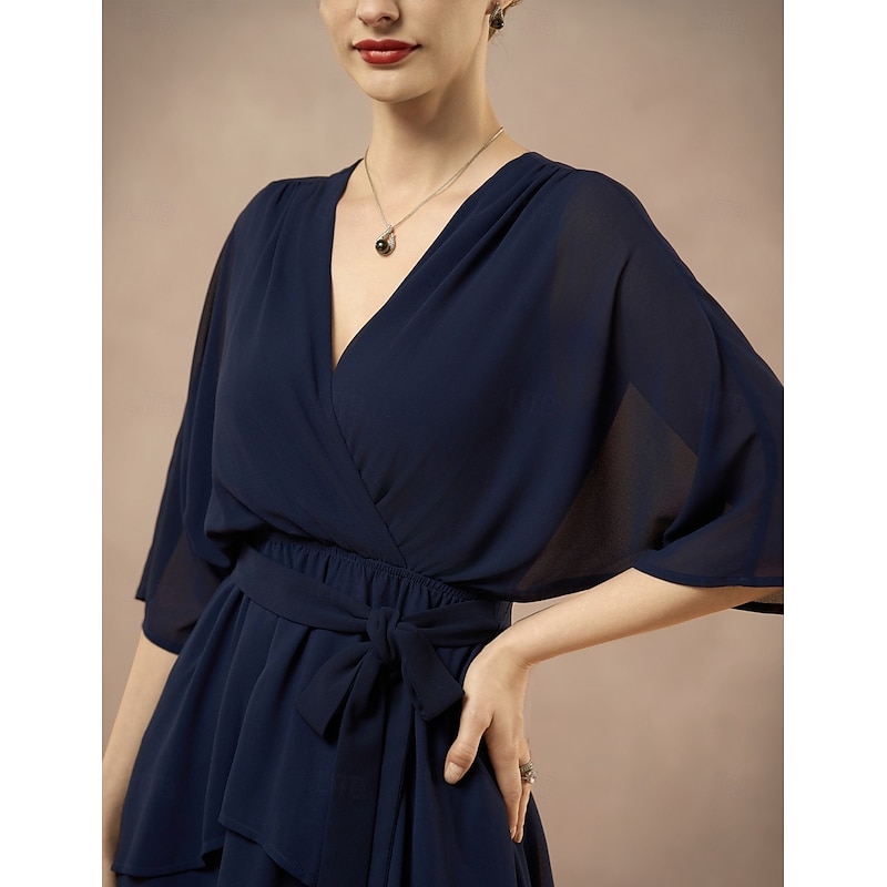 HOT ! A-Line Mother of the Bride Dress Elegant V Neck Floor Length Chiffon Half Sleeve with Bow(s) Cascading Ruffles Solid Color