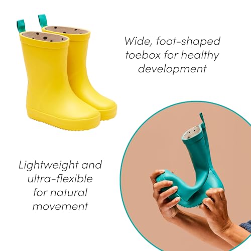 • LIGHTWEIGHT AND FLEXIBLE - These kids rain boots are perfect for little feet to wiggle, explore, and stomp through puddles in comfort. Making our rain boots toddler-friendly for those fun, rainy days