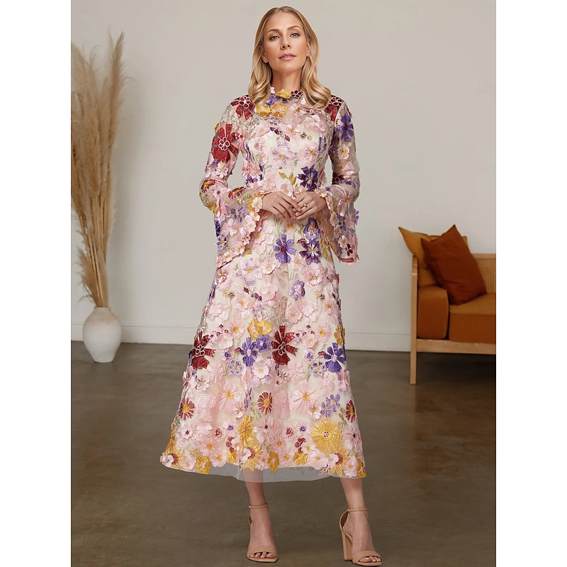 Highlights [Fabric] Crafted from luxurious tulle, this elegant dress features intricate floral embroidery that adds a sophisticated touch. The sheer material provides an airy and delicate feel, perfect for making a memorable impression at any formal event. [Silhouette] Designed in a flattering A-line silhouette, the dress gracefully drapes to ankle length, offering a timeless yet contemporary appeal. Its natural waistline further enhances the figure, creating a classic and elegant profile. [Design Highlights] The dress boasts a high neck, providing a modest yet sophisticated look, complemented by long bell sleeves that evoke a vintage-inspired aesthetic. These details give the dress an artistic flair, making it a standout piece. [Occasions] Ideal for formal events such as weddings, the dress is perfect for mothers of the bride or wedding guests looking to make an elegant statement. Its sophisticated design is suitable for any occasion that calls for grace and subtle glamour. [Size Range] Available in a wide range of sizes from US 0 to US 26W, including custom measurements for a perfect fit, this dress accommodates various body types and ensures comfort and confidence for all wearers.