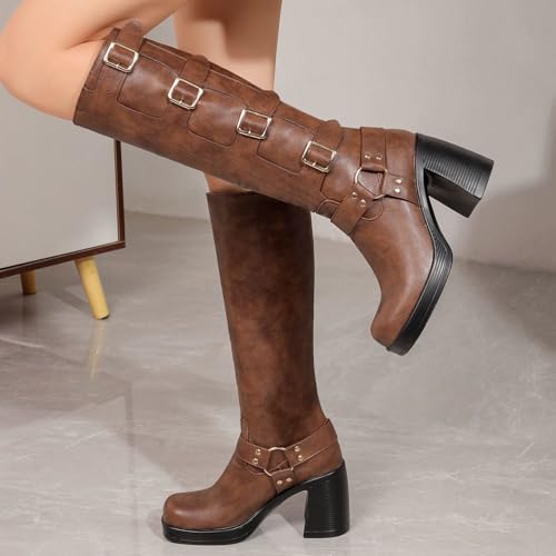 Seborluys Knee High Boots for Women Square Toe Pull On Riding Fashion Buckles Chunky Block Heel Biker Motorcycle Boots 7