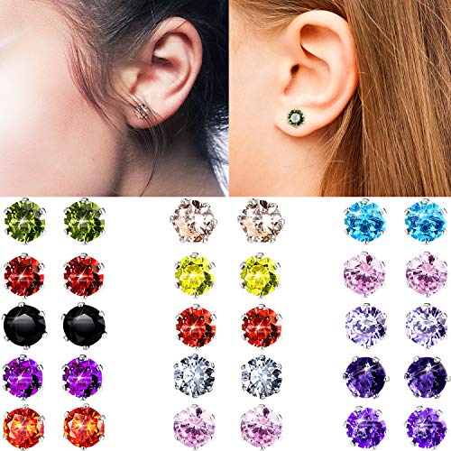 Boao 15 Pairs Stainless Steel Stud Earrings for Women Birthstone Hypoallergenic Cubic Zirconia Stud Earrings Set 2