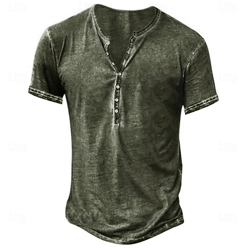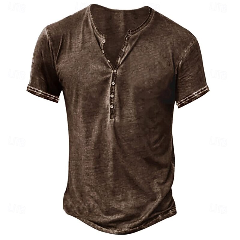 Men's Henley Shirt Tee Top Long Sleeve Shirt Short Sleeve Plain Vintage Fashion Basic Washed Henley Vacation Street Going out Summer Dark Brown Dark Grey Light Grey Henley T-Shirt 1