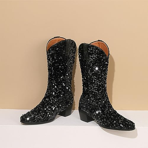 • Western style: Classic full sequin design on the entire upper, thick block shaped heels, Slip-On Pointed Toe Chunky Heels, wide calves.