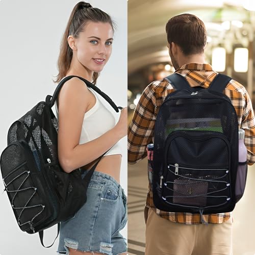Roomy and Convenient: Our mesh backpack has a large 16-20L main compartment that can accommodate a laptop up to 15.6 inches. And 2 front zipper pockets, 2 mesh side pockets designed to hold water bottles, umbrella. Backpack measures 12” x 17” x 5.3” = L x H x W (32 x 43 x 13cm) and has spacious space to organize your personal belongings while working and daily use, Perfect to hold your travel essentials such as clothes, power bank, laptop, toiletries bag, etc.Durable Material: Semi-Transparent mesh backpack is made of polyester mesh, not easy to break, lightweight and easy to carry. Crafted from durable materials, our mesh backpack features a sturdy and robust structure that can withstand heavy loads. The advanced cross-stitching techniques and reinforced shoulder straps ensure extra strength and durability.Comfortable Design: Designed with your comfort in mind, our mesh backpack features adjustable shoulder straps to fit a variety of heights and body types. A convenient top handle ensures easy grabbing. And the breathable fabric, ensuring coolness during warmer months. Experience unrivalled comfort on your journeys, where functionality meets breathability for a truly enjoyable carry.Fashion and Practical: The mesh backpack seamlessly blends contemporary style with functionality, allows you to showcase your personal style while staying practical. When it comes to day trips and hiking close to camp or beach, owning a small backpack is pivotal. Its roomy capacity, durable materials and comfortable design make it suitable for a variety of occasions. It will be a fantastic necessity for no matter outdoor sports or leisure activities in or out of the city.Multi Scenario Use: A perfect companion for a variety of scenarios, including daily commute, travel, study, cycling, shopping and work, adapting seamlessly to your lifestyle needs. And the reflective signs on sides of the backpack that enhance visibility to remind safety. These unisex design see through bag makes it suitable for both women and men. Also a great gift for your family and friends. Perfect for everyday use. High quality materials and excellent craftsmanship ensure long-lasting durability.