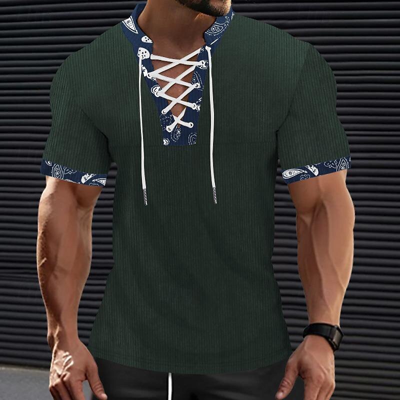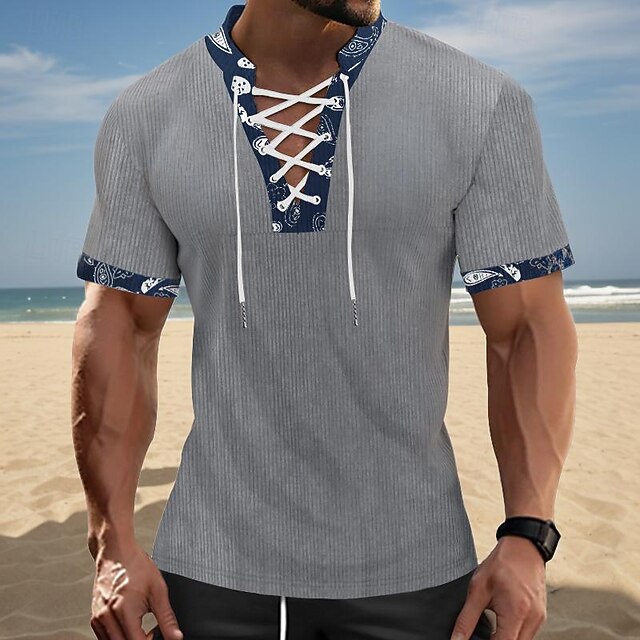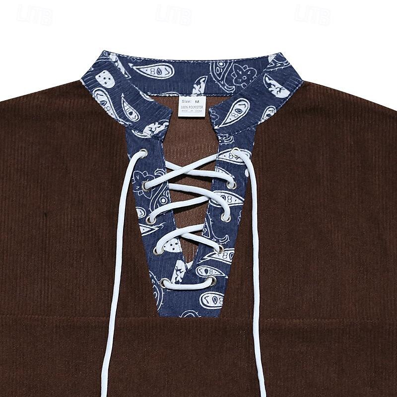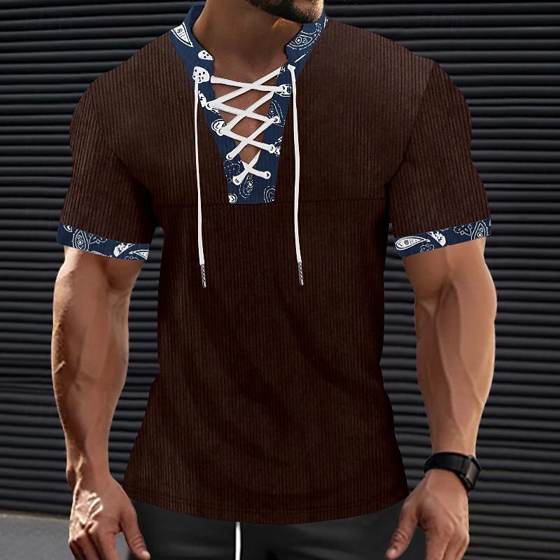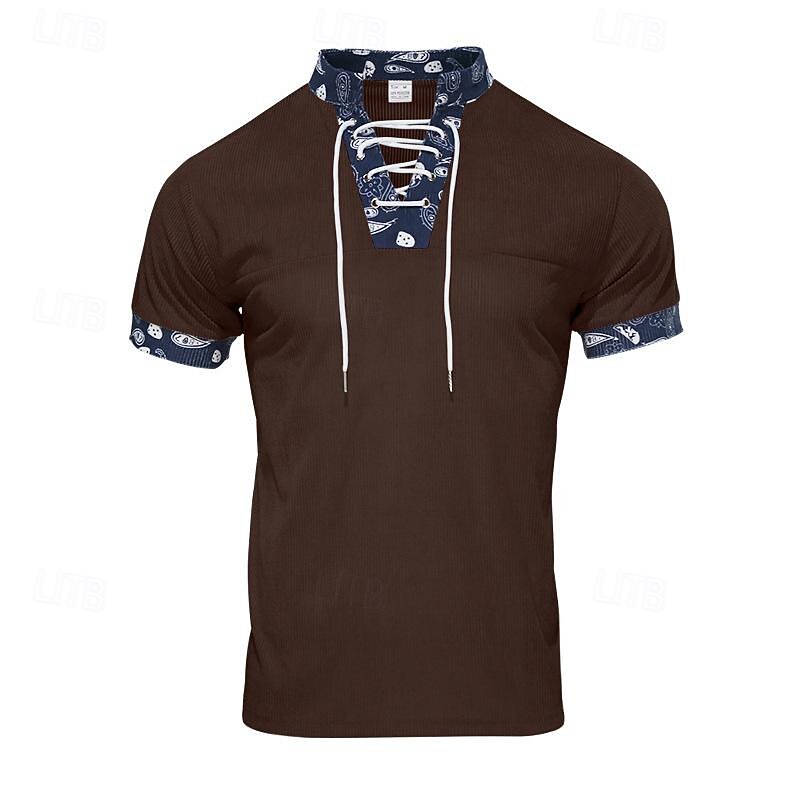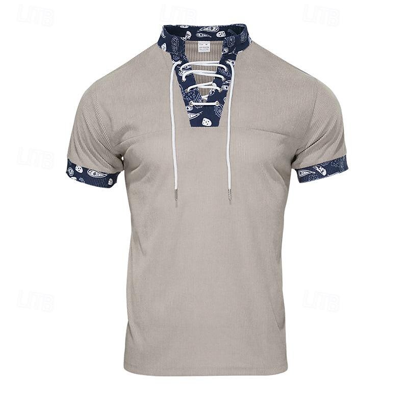 More information about Men's T Shirt Corduroy Shirt Tee Short Sleeve Shirt Short Sleeve V Neck Spring & Summer Color Block Fashion Designer Basic Lace up Patchwork Vacation Street Going out Black Brown Khaki Top Tee for Men