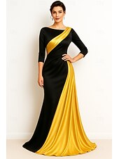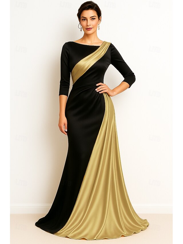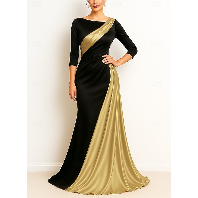HOT ! Black Gold A-Line Evening Gown Elegant Dress Formal Wedding Floor Length Long Sleeve Boat NeckMother Of the Bride Dress Stretch Satin with Pleats