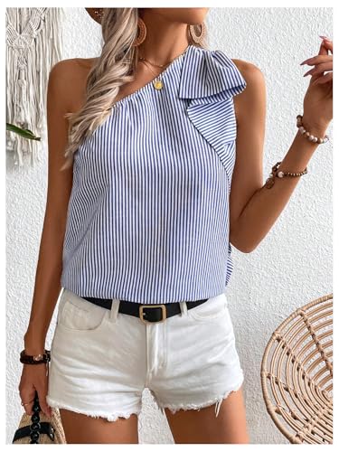 OYOANGLE Women's Striped Ruffle Trim One Shoulder Tank Top Sleeveless Tunic Blouse 1