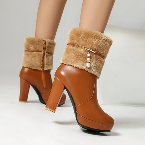 • Platform Chunky High Heel Boots Style: The Ankle booties with fur and pearl decoration design showcase a classic modern style.