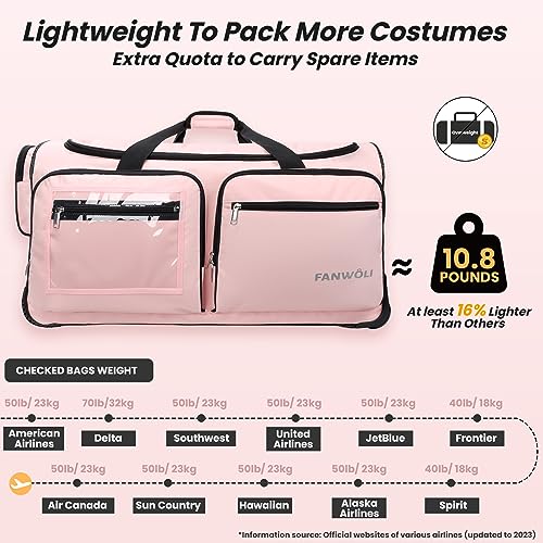 Join Prime Cancel anytime💃【Dancer's Must-Have】Featuring a resilient aluminum handle, silent wheels, and a detachable rack, this professional dance bag is not just your equipment, but also your reliable companion for success on stage. A integration of a garment rack and a wheeled travel bag, allows you to neatly arrange your competition essentials, ensuring your clothes remain wrinkle-free. Having this dance bag with garment rack helps you handle unexpected situations and prepare methodically before competitions.🛡️【Premium Material】Designed with a sturdy dual-support system – embedded metal base and extendable rack, enhancing stability by 25% compared to others. Crafted from water-resistant 300D Oxford cloth composite PVC to withstand even the toughest travel conditions, it is more resistant to abrasion and tearing, and maintains its shape and structure better than nylon. An ideal dance costume bag that is durable enough to witness all your competitions and awards.👍【Ample Space】As a roomy duffle, it boasts 10 multifunctional compartments, fulfilling your needs for competition. The interior has one main compartment and four mesh pockets. The exterior features one long zip pocket for folding chairs and long props; A thermal zip bag helps maintain the temperature of snacks and drinks, and be used as a small energy supply station during long waits; A side zipper pocket for small items; A front zip pocket with hole for shoes.📌【Compact & Lightweight】 Dimensions: 28 x 15 x 14. Weight (Empty): 13.5lbs. Rack max load 25lbs, holds approx. 12 costumes. *Be considered “checked="" luggage” by most airlines. It is recommended to check the specific airline's fee standards before traveling.🎁【Ideal Gifts】Whether it's used as a professional competition bag for dancers and skaters or a portable wardrobe for livestreamers and actors changing clothes, our dance bag is the leading choice. It's especially suitable as a gift before birthdays, Christmas, or major competitions. 60-day no-questions-asked refund. Exclusive brand service is always available to assist you. If you need to make a large purchase for your dance studio, you can contact Fanwoli service for support.