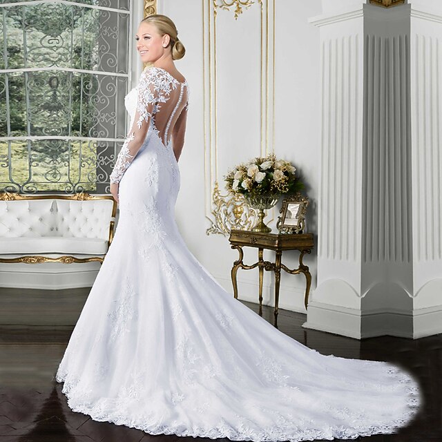 More information about Open Back Sexy Formal Wedding Dresses Mermaid Illusion Neck Long Sleeve Chapel Train Lace Bridal Gowns With Lace Appliques