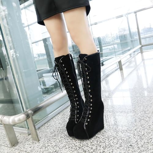 Bellirala Womens Hidden Wedge Knee High Lace Up Platform Boots with Zip