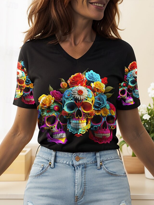 More information about Halloween Women's T Shirt Skulls Floral Graphic Vintage Stylish Classic Short Sleeve V Neck Regular Tops Daily Print Black Orange Gray Summer Spring