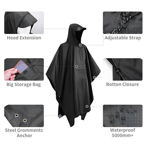 • Waterproof & Durable Material:Made of 210T Tear-Resistant polyester with PU coating, this rain poncho boasts a PU5000MM waterproof rating. Enhanced with Seam Tape techniques, it prevents water from seeping through the seams. The poncho features a drawstring hood and hook and loop fasteners along the sides for a secure, adjustable fit, providing excellent protection for your head and face.