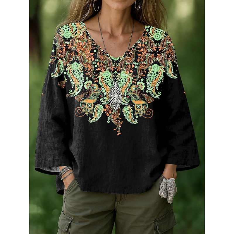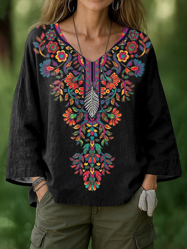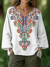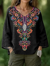 More information about Women's Blouse Floral Graphic Geometric Bohemia Vintage Hawaiian Long Sleeve V Neck Regular Tops Ruched Print Black White Green Summer Spring