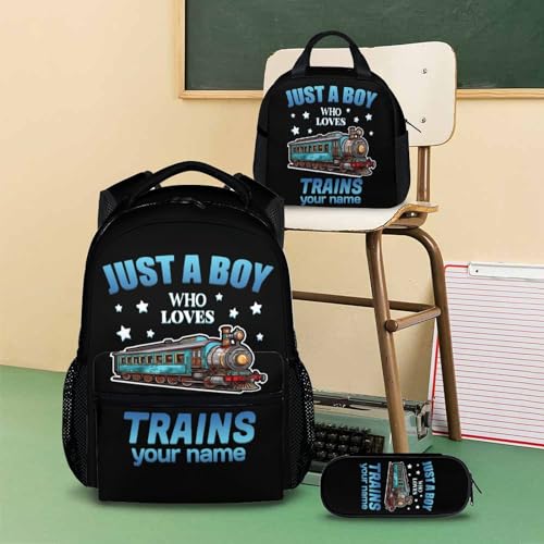 Custom Kids Backpack with Lunch Box Set for Boys Girls, Set of 3 Train School Backpacks Matching Combo, Personalized Cool White Bookbag and Pencil Case Bundle 3
