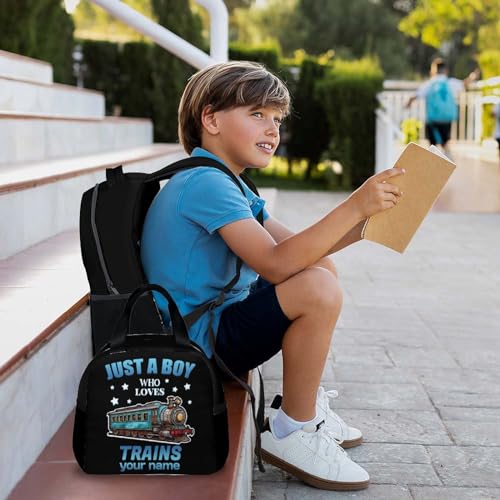 Custom Kids Backpack with Lunch Box Set for Boys Girls, Set of 3 Train School Backpacks Matching Combo, Personalized Cool White Bookbag and Pencil Case Bundle 4
