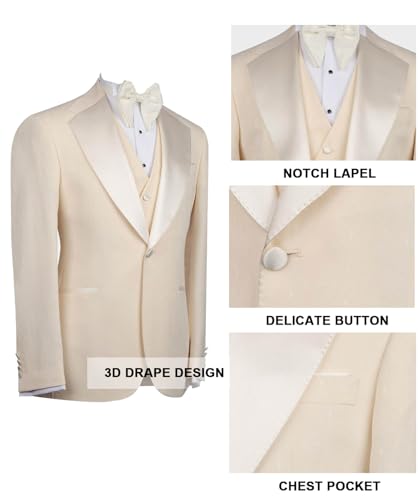 Men's Slim Fit 3 Piece Suit Beige Solid Prom Wedding Blazer Pants Vest Tuxedo Suits Set for Men 5