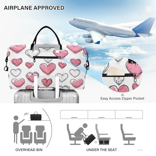 White and Pink Hearts Travel Duffle Bag,Large Weekender Travel Bag for Women Men Waterproof Luggage Bag with Trolley Sleeve,Airplane Travel Essentials for Flying 6