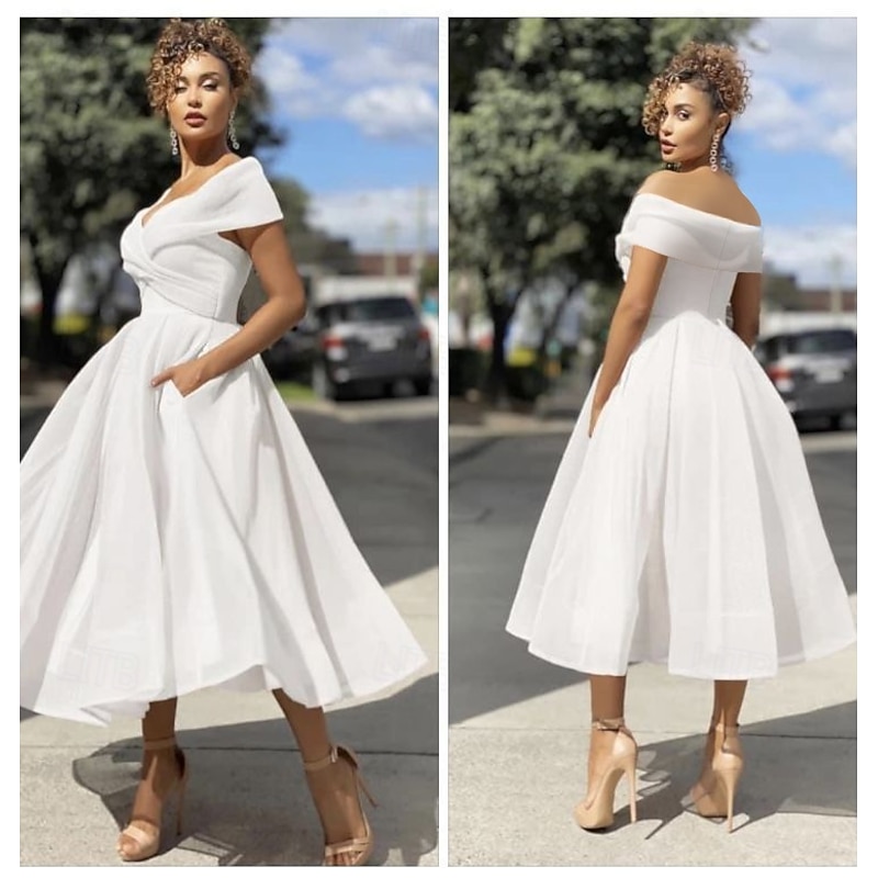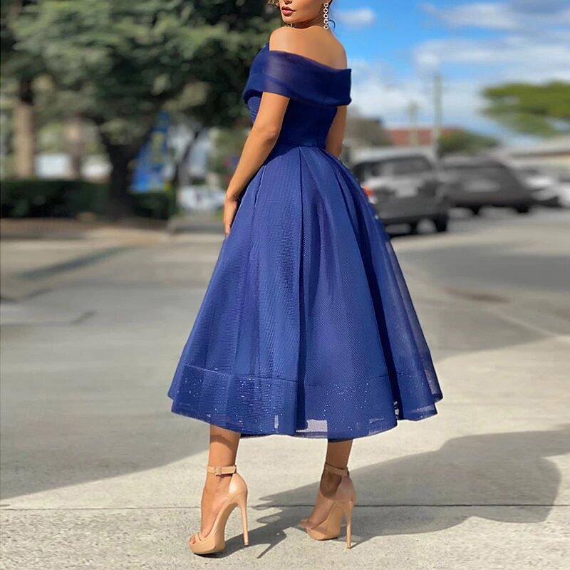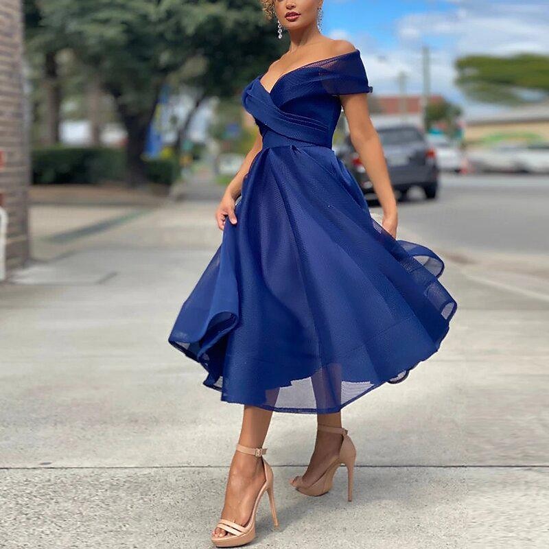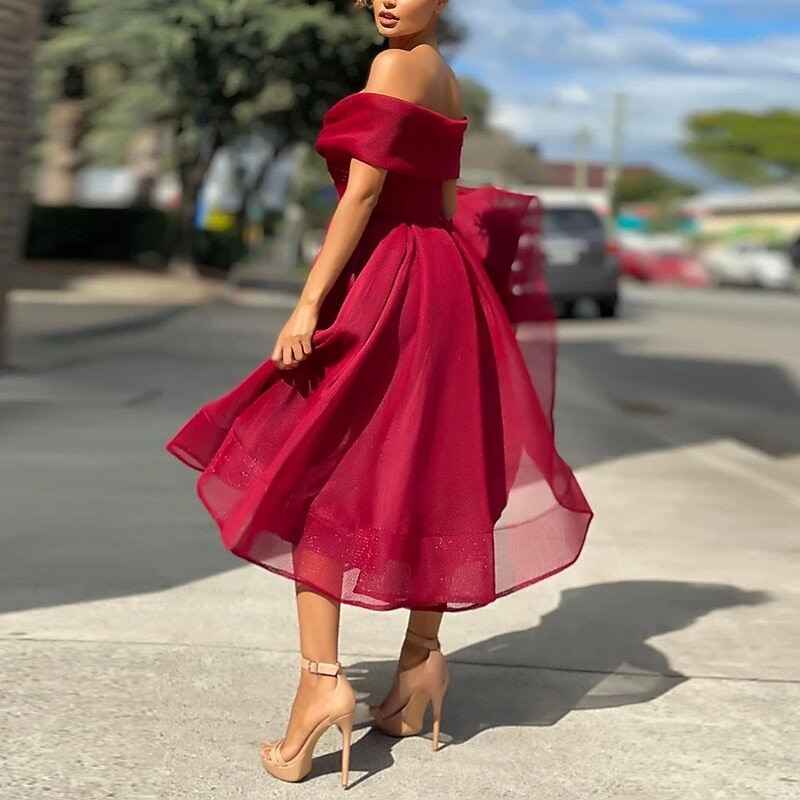 More information about Beach Wedding A-Line Cocktail Dresses Vintage Dress Wedding Guest Tea Length Sleeveless Off Shoulder Tulle with Pleats Dresses