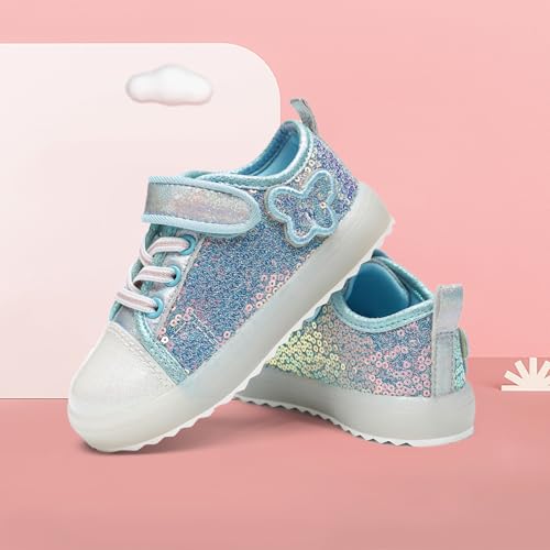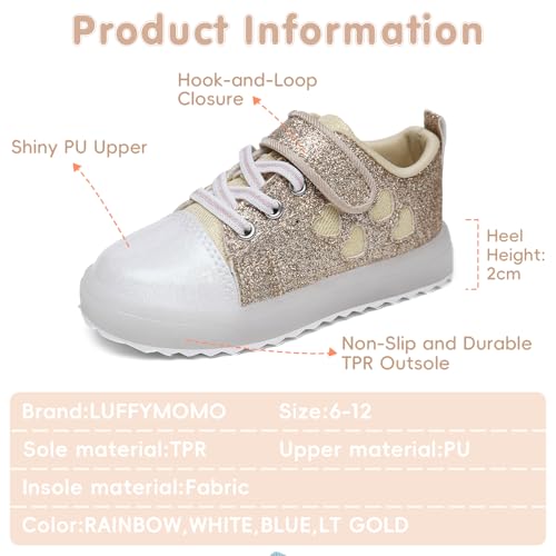 • 【Unique Design】Girls casual sneakers are made of sparkle upper and decorated with unique heart that are perfect with cute effects that kids will love.The blue upper is made of sequin material, while the other colored uppers are made of glitter, make your shoes look unique and shiny. Attention: The material of the rainbow and light gold shoes uppers are glitter, and slight powder fall down is normal.