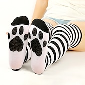 Highlights [Fabric] : Crafted from a premium blend of polyester and acrylic fibers, these over-the-knee stockings offer warmth and comfort. The material is designed to be breathable yet durable, perfect for keeping your legs cozy during the colder seasons. [Fit] : These stockings feature a snug fit due to their stretchy acrylic and polyester blend, ensuring they remain in place throughout the day. The over-the-knee length adds a touch of elegance and style while serving a practical function by providing additional warmth. [Design Highlights] : Adorned with a bold and retro stripe pattern, these stockings bring a playful and stylish element to your wardrobe. The charming paw print motifs on the soles add a whimsical touch that enhances the overall aesthetic. [Occasions] : Ideal for a variety of settings, these stockings can be worn for parties, daily activities, or simply lounging at home. Their versatile design makes them perfect for cosplay events or adding a bit of flair to your everyday attire. [Size] : Available in a convenient one-size option, these stockings are designed to fit most, providing a comfortable and adaptable wear for women seeking both style and function.