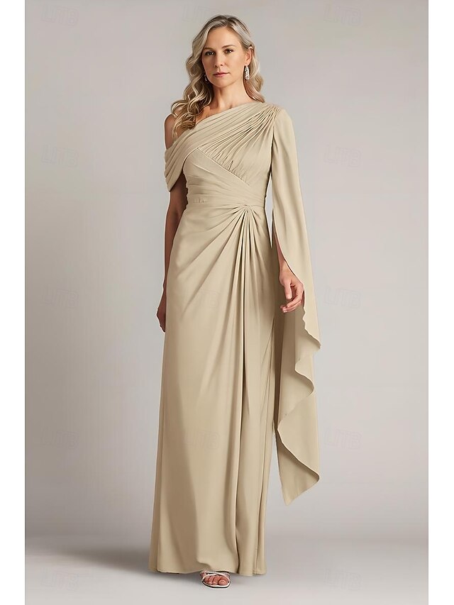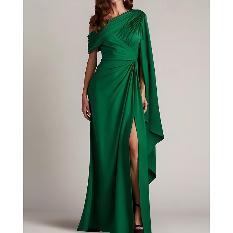 More information about Sheath / Column Mother of the Bride Evening Gown Elegant Dress with Cape Overlay Formal Wedding Guest Floor Length Sleeveless One Shoulder Satin with Pleats Ruffles