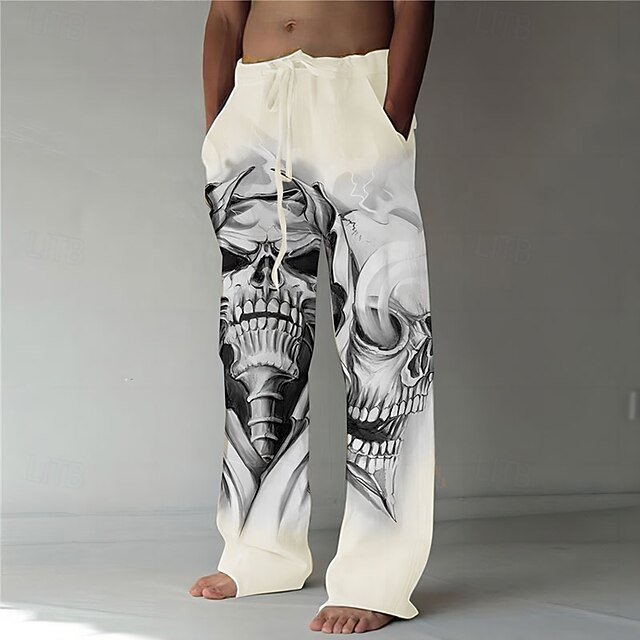 Men's Skull Graphic Prints Linen Pants Trousers Baggy Pants Mid Waist Fashion Big and Tall Casual Daily Elastic Drawstring Design Front Pocket Straight Leg Spring & Summer 3D Print White Green Khaki 3
