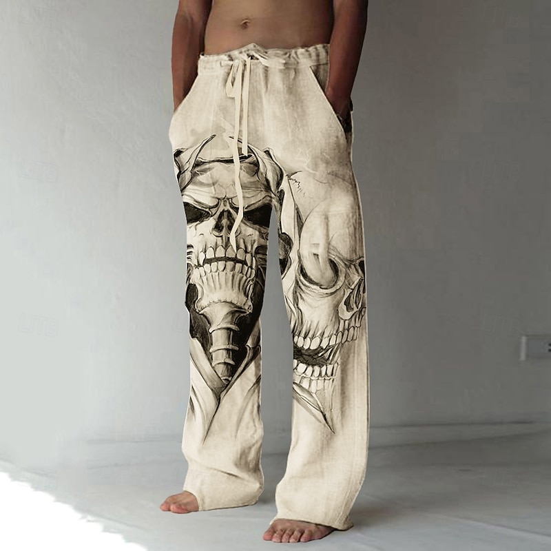 More information about Men's Skull Graphic Prints Linen Pants Trousers Baggy Pants Mid Waist Fashion Big and Tall Casual Daily Elastic Drawstring Design Front Pocket Straight Leg Spring & Summer 3D Print White Green Khaki