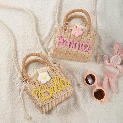 Personalized Crossbody Straw Bag Toddler Girl Flower Play Purse Custom Name Little Girl Beach Hand Bags Embroidered Baby Girls Purses with Customized Name Gift Basket Kids Tote Bag Birthday Gifts 1