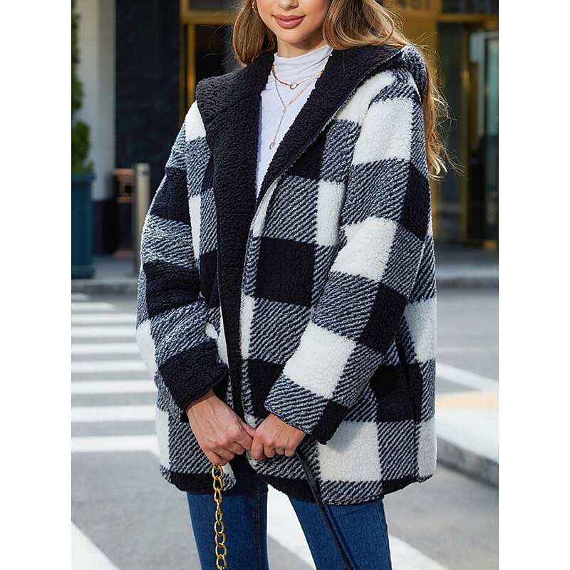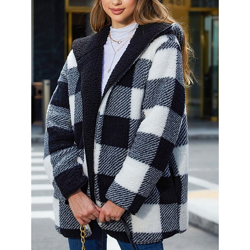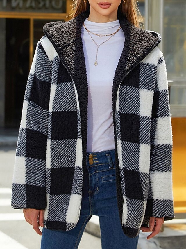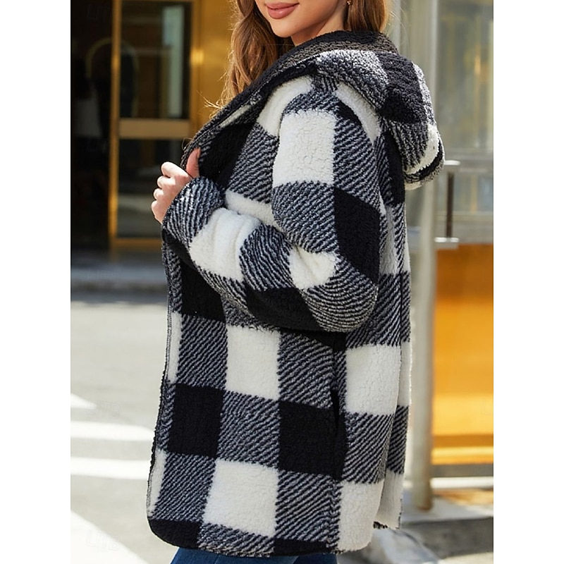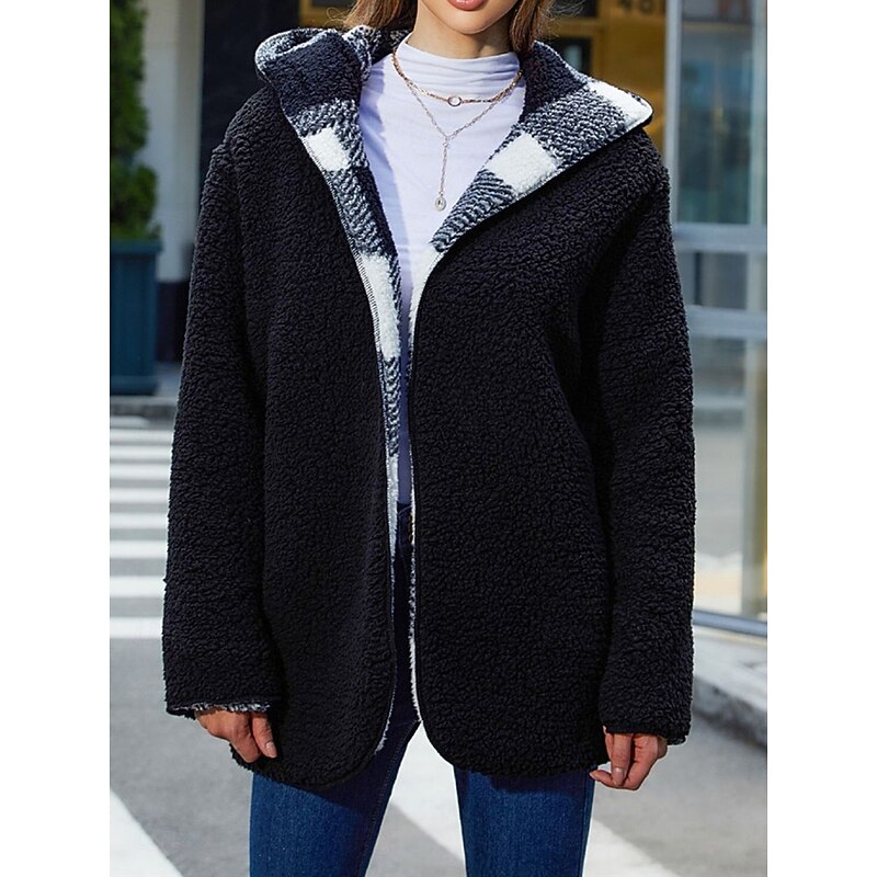 More information about Women's Fleece Jacket Teddy Coat Hoodie Jacket Warm Breathable Pocket Fleece Lined Casual Plaid Vacation Street Daily Wear Going out Open Front Regular Hoodie Regular Fit Long Sleeve Outerwear Black