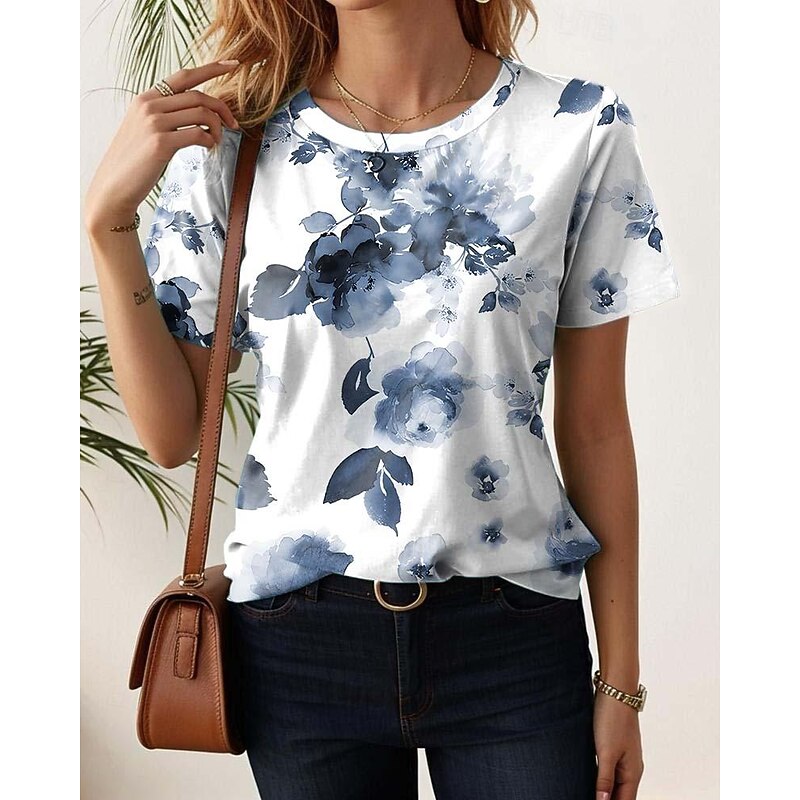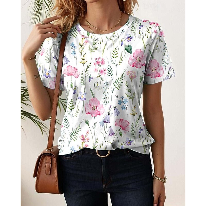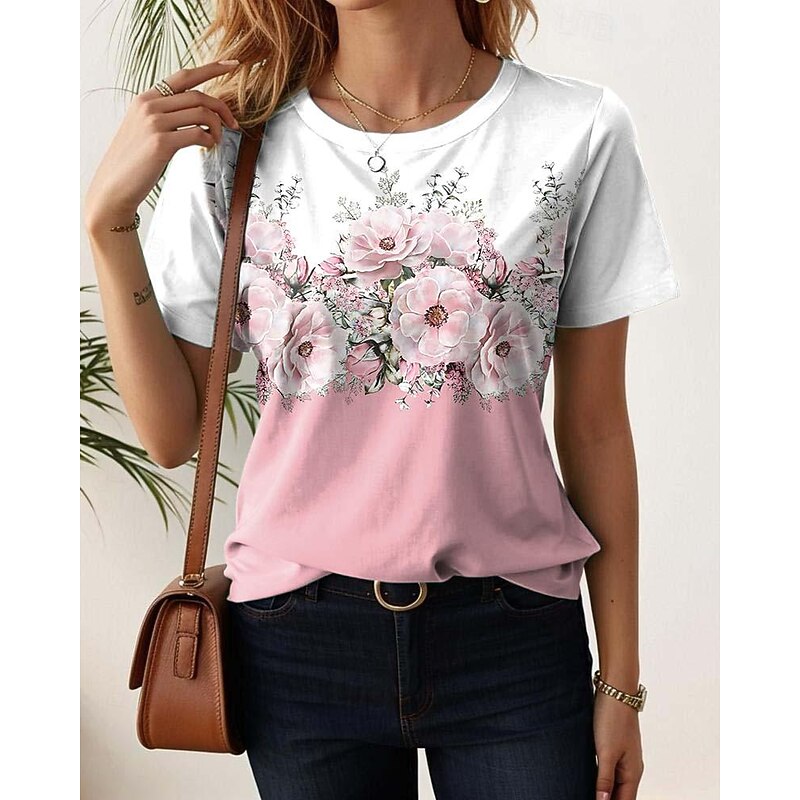Women's T Shirt Stylish Casual Print Short Sleeve Regular Tops Crew Neck Daily White Pink Purple Light Blue Summer 12
