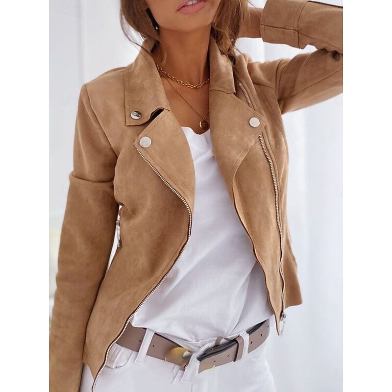 More information about Women's Faux Leather Jacket Comfortable Breathable Zipper Casual Plain Vacation Street Casual Daily Wear Zipper Short Lapel Slim Long Sleeve Outerwear Black Navy Blue Khaki Spring Fall