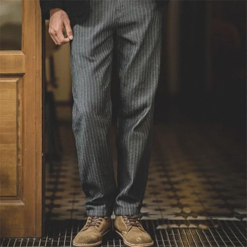 Men's Vintage Gray Vertical Stripe Jeans Mid-Rise Straight Tapered Fit Casual Cotton Pants