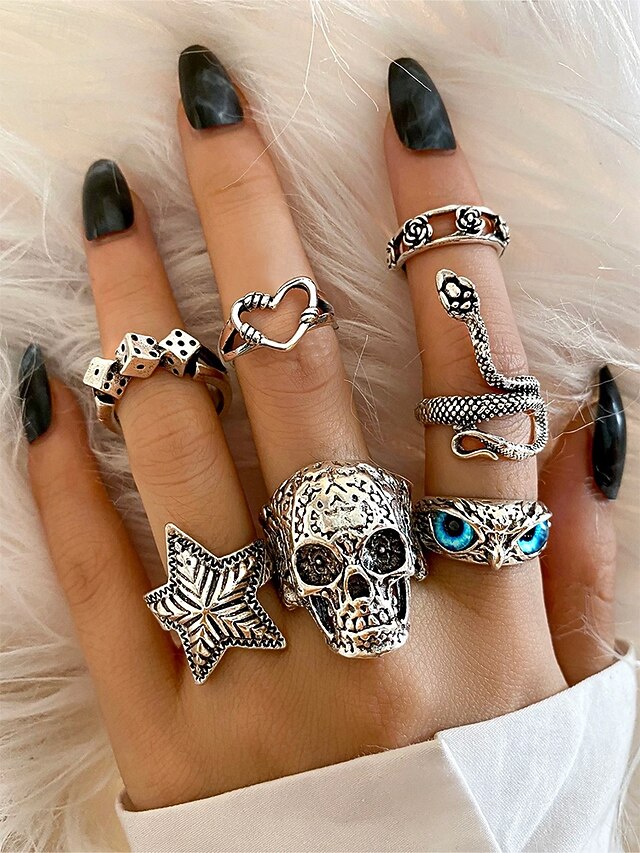 $7.99 - Women's Halloween Gothic Ring Set – Vintage Silver Skull Snake Star Dice Adjustable Rings for Party, Cosplay and Nightlife 2025. Shop for cheap Halloween Accessories online? Buy at lightinthebox.com on sale today!