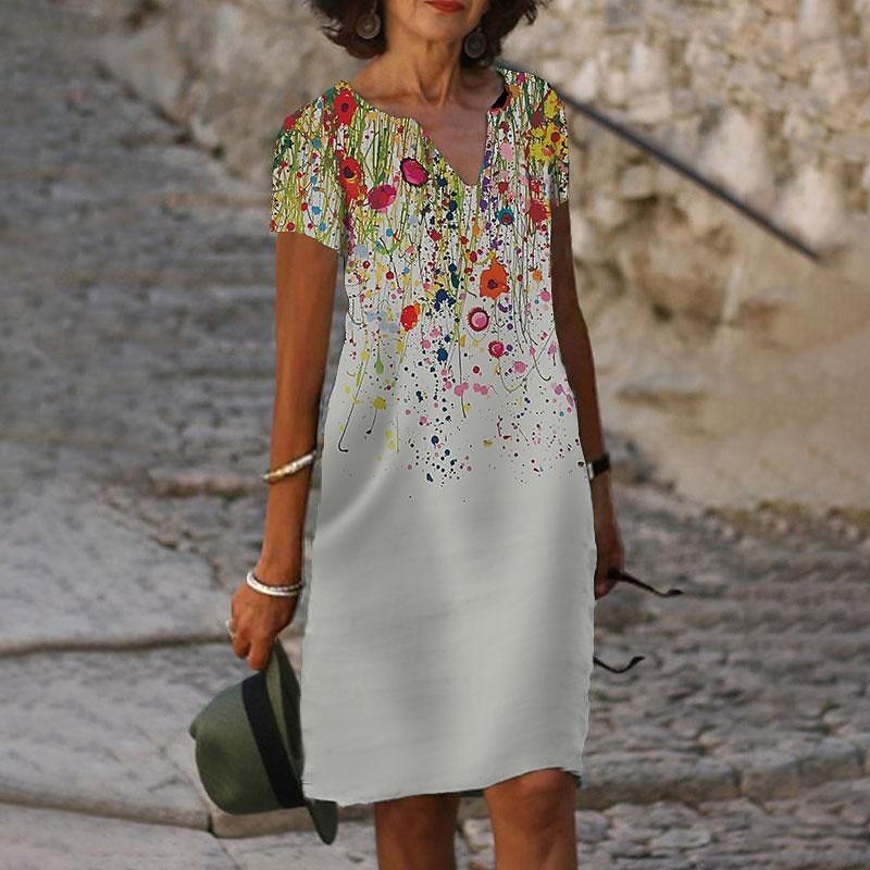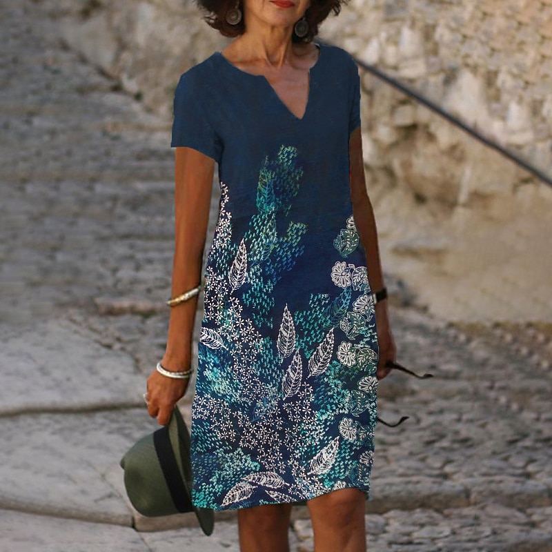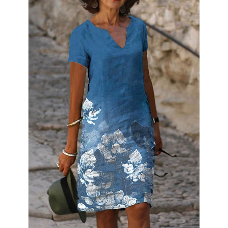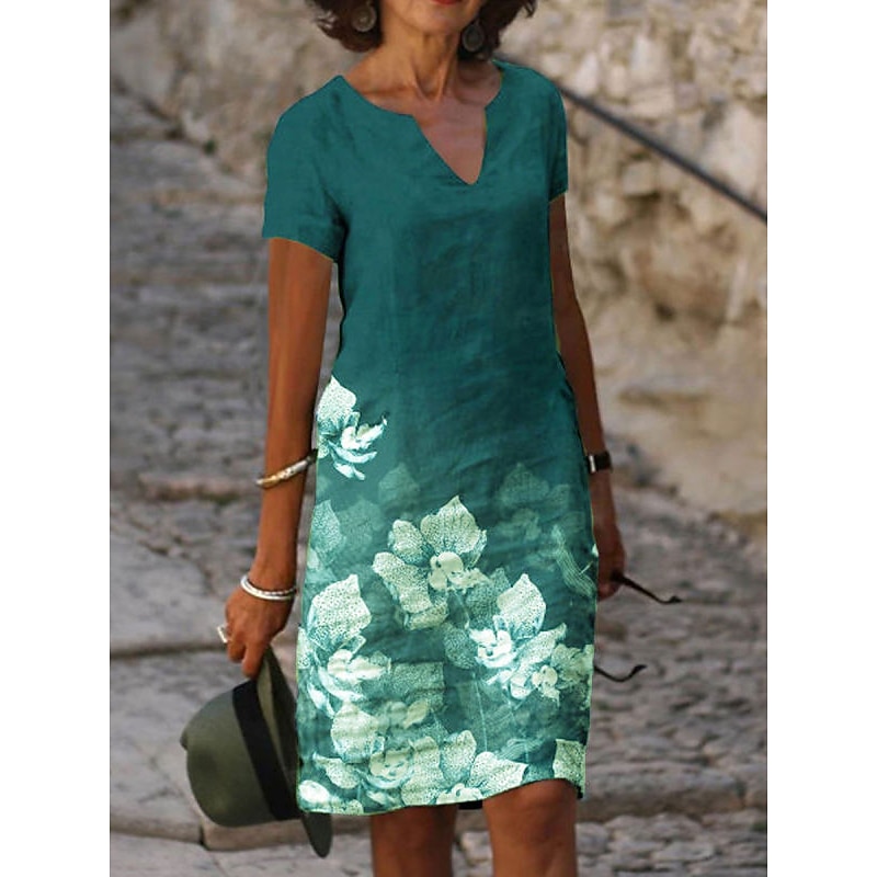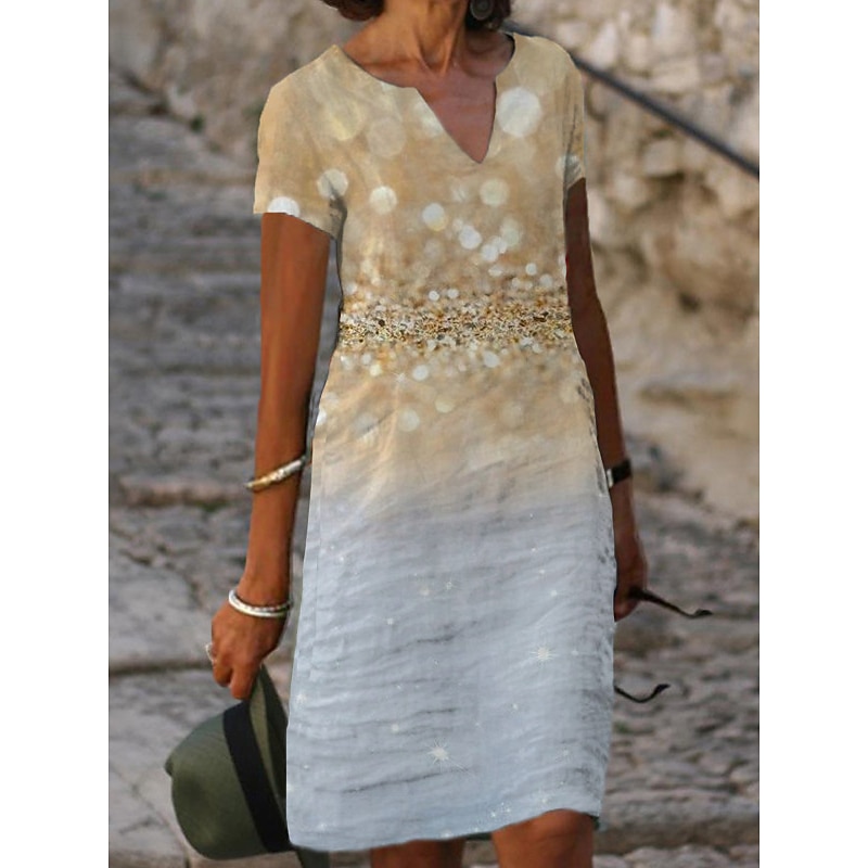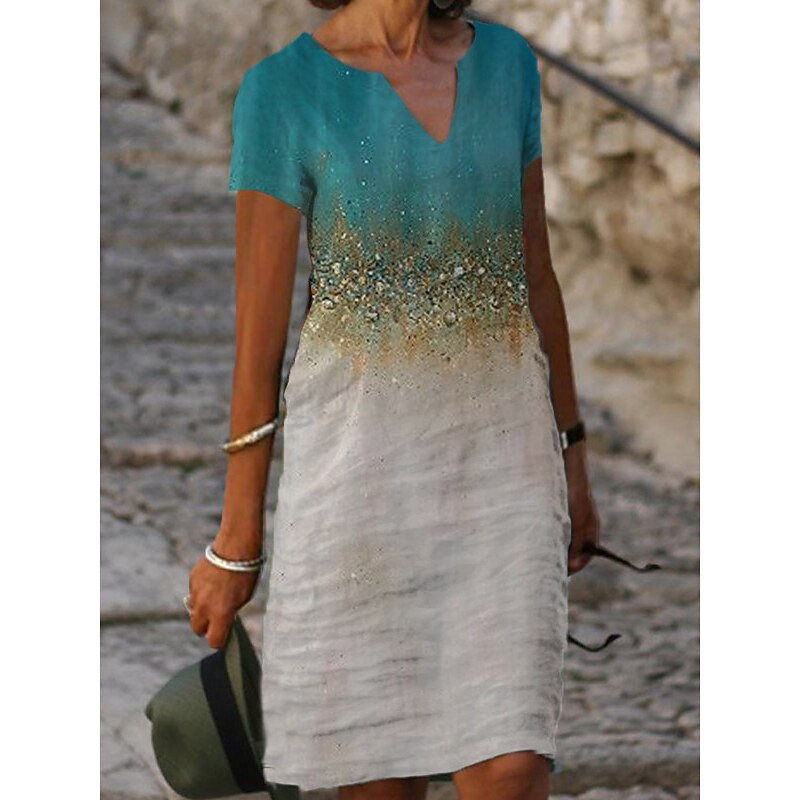 Highlights - Enjoy a fashionable and comfortable look with this gradient color knee-length skirt and short-sleeved casual style dress, perfect for any occasion from beach to daily life. - Made with lightweight, soft, comfortable, and airy fabric, ideal for hot summer and humid days without the see-through aspect. - This dress is a perfect match with flats or slippers for a casual look. - Easy to maintain with machine and hand wash options available and max temperature of 40°C. - Ideal for women who love to be trendy and elegant during spring and summer seasons, and perfect for those vacation days. - Beautiful V-neckline design and dress length type midi for a sleek and sophisticated look.