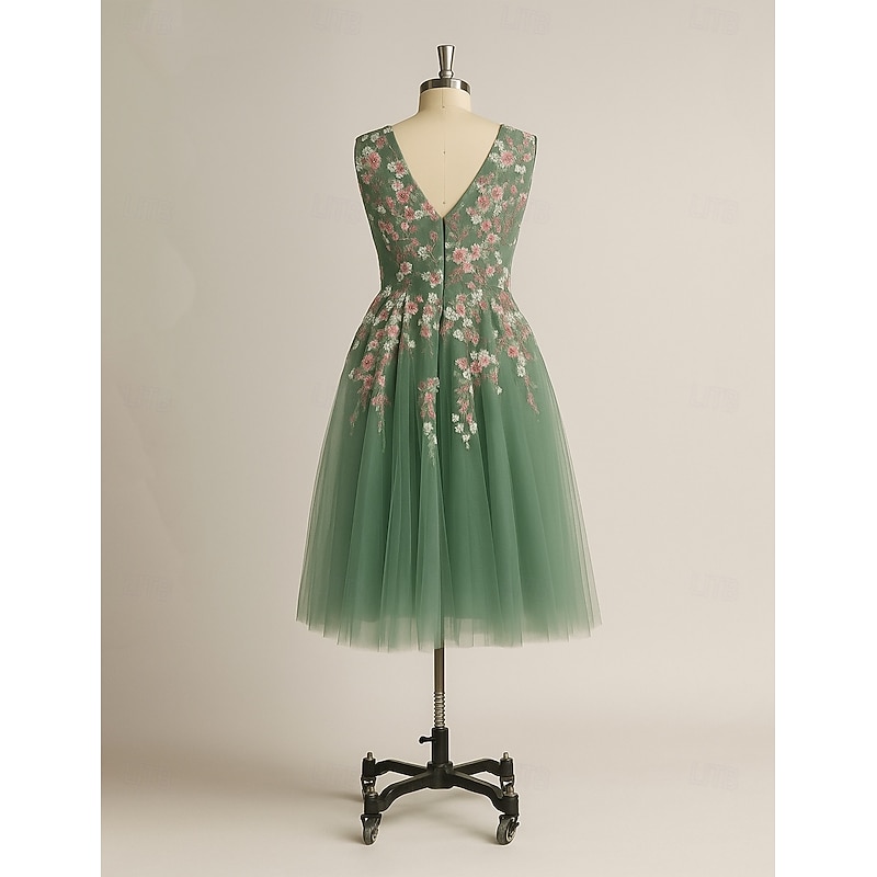 More information about Floral Embroidered Lace A-line Tulle Prom Dresses Elegant Dress Formal Wedding Guest Tea Length Sleeveless V Neck