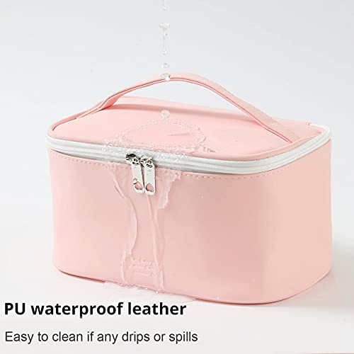 [long-lasting Material]:The cosmetics bag for woman is made of high-quality PU leather. Waterproof material, easy to clean and maintain, never worry about spills or leaks. The dual metal zipper clips with hearts on, durable and fluent for frequent use, wide open for easy access[Vibrant Color]: sophisticated and bright color design makes it a cute preppy makeup bag for Ladies, twenties it is simple and lightweight, not fade over time, can hold all your daily basic makeup products securely you need for your traveling. Wide and firm handle for easy carrying[Good Size]: Deminsion(LxWxD): 9x6x4.5 inches,little bag small size to fit in the corner of your suit case or lugguage. Durable handle, roomy pockets in the lid with an elastic band to fix little things brushes, watercolor pen, stamperss pen, stamperscils in place. It works great for Overnight Trips[Large Capacity]: Medium size can fit numerous full sized things in alongside makeup brushes,this moderate bag big enough for all your make up kit, meds and diabetic supplies,medications, lotion, tweezers, pony tails,hair brush skincare products; Also as a toiletry bag with sturdy handle easily to carry and hold all your travel-size toiletries[Gift for her]: This versatile cosmetic bag is suitable for or business trip and useful in bathroom organizing. Good and practical choice for Valentine's Day, Christmas, Mother's Day, Teacher's Day, Thanksgiving Day and Friends Birthdays. Also Good for your bridesmaid proposal boxes!