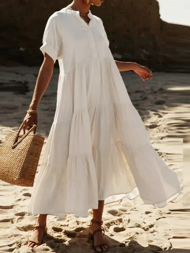 HOT ! Women's White Dress Maxi Dress Ruffle Casual Stand Collar Long Sleeve Black White Yellow Color